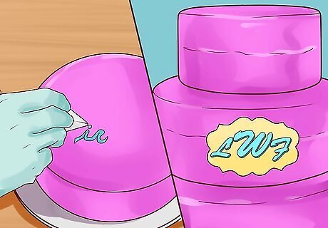 Write on or monogram the cake. If you're new to using a pastry bag, you should practice writing your message several times on a scrap piece of paper or a plate first. You might also simulate the contour of a cake by practicing writing with your pastry bag on a piece of fruit, like an apple. Once you're comfortable, distribute your message across the surface of your cake. A fine tip on your pastry bag is ideal for writing messages. You might plot out your message or the letter of your monogram with toothpicks first. Then you can trace the holes left by the toothpicks with your icing.