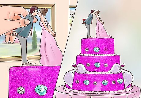 Cap the cake with a wedding topper. This will depend on the bride and groom. They may want a traditional miniature man and woman in formal wear atop their cake, or they might want Han Solo and princess Leia. Place your cake topper and your cake is ready to be admired!