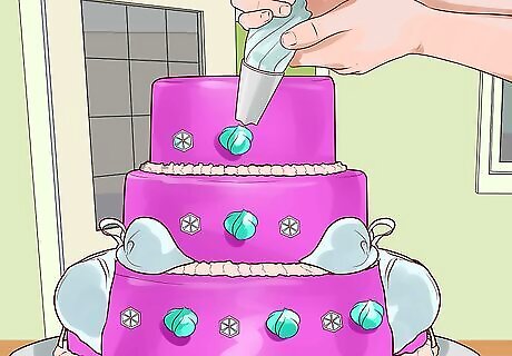 Create borders and designs. This can be difficult for beginners, but using your pastry bag you can create borders, pearls, or flowers out of the frosting. You may even want to try a Cornelli pattern, which is where a very thin layer of frosting is applied to the surface of the frosting in squiggly lines that thread throughout the exterior without touching or crossing any lines. You might try: Making roses with icing Making other frosting flowers Decorating with fondant
