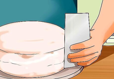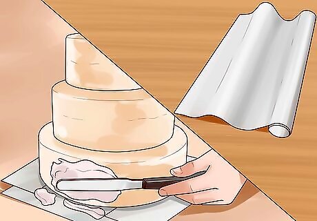 Reinforce your cake before frosting. The base of your cake should be supported by a clean cakeboard that is cut to fit the size of your cake. Glue your cakeboards into place underneath each level of your tiered cake by spreading a thing layer of your frosting between cake and cakeboard.