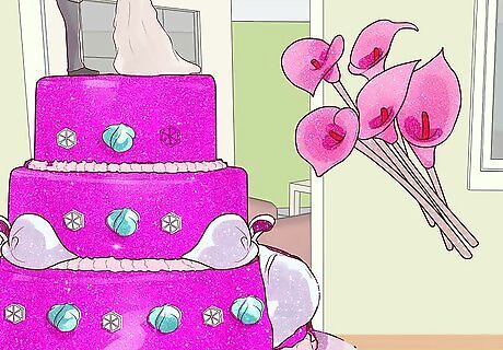 Arrange time sensitive features as late as possible. A good example of this would be flowers, which can wilt if left out for too long. Place the clean, fresh flowers in a nice arrangement on the cake right before it is displayed to guests. This touch creates a simple but elegant wedding cake decoration.