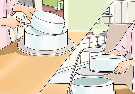 Stack your cake. Now that your cakeboards are in place and your frosting application completed, you can move on to stacking your cake. If you are using a cake stand, all the easier - simply put each tier in place on the stand and your cake is stacked. If using supports, you'll need to: Cut clean wooden dowels to the same length for your supports. Arrange your dowels in each layer of your cake excluding the top layer. Leave an inch between the border of each cakeboard and your supports. Stack one layer atop the next. Consider running a long, thin, sharpened dowel through the center of each tier to stabilize your cake.