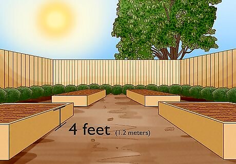 Be sure to add pathways between the garden beds. This will allow you to go through your garden without trampling your fruits, herbs, and vegetables. Something around 3 feet (0.91 meters) wide would be ideal. This way, you can push a wheel barrow down for transporting your harvest, soil, mulching, etc. Your pathways can be made from anything you want, including: bark, bricks, gravel, or stepping stones.