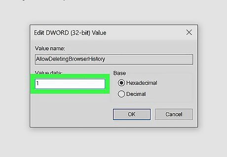 Create a DWORD inside the key called "AllowDeletingBrowserHistory." Here's how: Right-click the blank area in the right panel. On the menu, select New > DWORD (32-bit Value). Type AllowDeletingBrowserHistory and press the Enter key. Double-click AllowDeletingBrowserHistory to open the editor. If you don't see a zero under "Value data," enter one now and click OK.