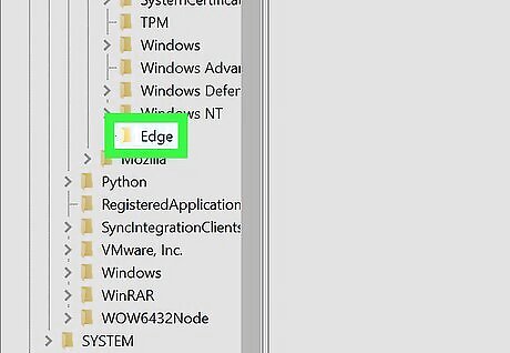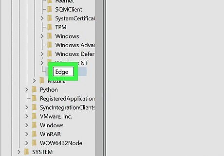 Create a new key called Edge. Although you'll already see a key in here called "MicrosoftEdge," you actually need to create another one. Here's how: Right-click the Microsoft folder in the left panel. A menu will expand. Select New > Key. Type Edge and press Enter.