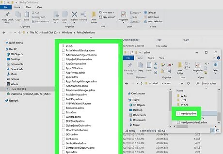Copy the required policy files from MicrosoftEdgePolicyTemplates to PolicyDefintions. Here's how: In the File Explorer window that's open to MicrosoftEdgePolicyTemplates, double-click windows, and then double-click admx. Drag the file called msedge.admx at the bottom of the window over to the C:\Windows\PolicyDefinitions window. Allow the file to be overwritten if prompted. Double-click the folder called en-US in both open File Explorer windows. Drag the file called msedge.adml from the MicrosoftEdgePolicyTemplates window to C:\Windows\PolicyDefintions\en-US. Allow the file to be overwritten if prompted. Now you can close all of these pesky File Explorer windows.
