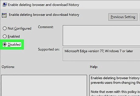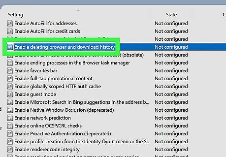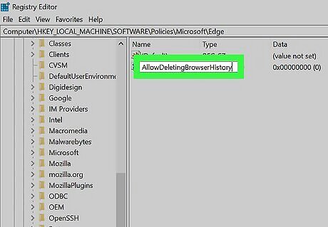 Re-allow deleting the browsing history. If you share the computer with others, you may want to re-enable deletion of your browsing history at some point. Fortunately, now that you've created a registry key, it'll be easy to toggle between allowing and denying deletion. Here's how: Re-open the registry editor and navigate to HKEY_LOCAL_MACHINE\SOFTWARE\Policies\Microsoft\Edge. Double-click the AllowDeletingBrowserHistory entry in the right panel. Replace the "0" with a "1" and click OK. Restart Edge.