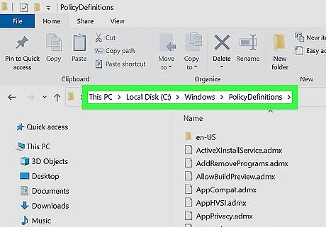 Go to the PolicyDefinitions folder in the new File Explorer window. The location is C:\Windows\PolicyDefinitions. To avoid confusion, we'll call the first window you opened "MicrosoftEdgePolicyTemplates," as that's what you'll see in the title bar. We'll call the second one "PolicyDefinitions."
