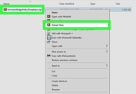 Decompress the files. To do this: Double-click the CAB file—it will open in 7-Zip. Click the Extract button in the toolbar. Choose a location to extract the file inside to and click OK. Press Windows key + E to open File Explorer. Go to the newly-compressed file, which is called MicrosoftEdgePolicyTemplates.Zip. It's actually another compressed file—however, this time it's a ZIP file that you can unpack without worrying about 7-Zip. Right-click MicrosoftEdgePolicyTemplates.zip and click Extract All. Click Next to extract the files, which creates a new folder inside the current folder called MicrosoftEdgePolicyTemplates.