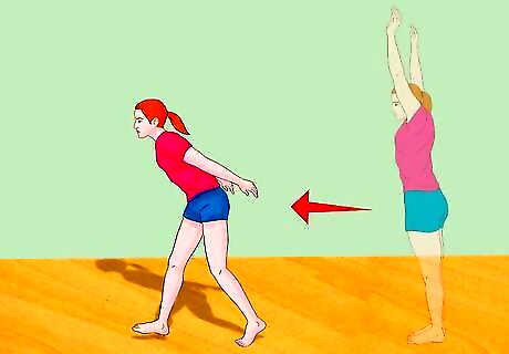 Get a good run. It is best for you to do a running round off to prepare yourself to do a round off back tuck. Run for a few steps and then hop with your right foot. Lift you arms up as you hop with your right foot.Make sure you are running on your toes and are not flat-footed. Make a line that marks the distance where you will start your run. The distance from where you start your run to where you plant your hands for your round off should be the length of your body plus the length of your arm. You can practice your round off without running first if you would like. If you can do a standing round off, you will definitely be able to do a running round off.