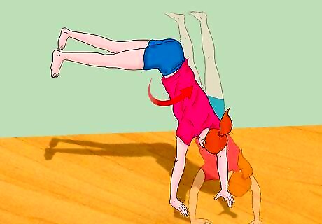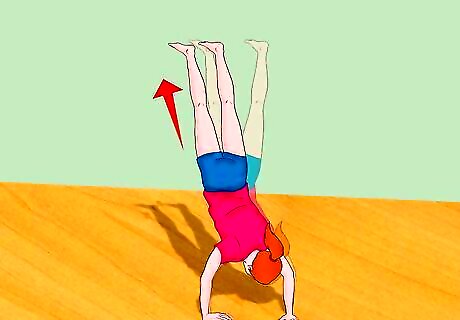 Push yourself off the ground. Once both of your hands are on the ground, you can push yourself off of the ground. Shrug your shoulders upwards and push down on the ground with your hands. Your elbows should be straight as you are pushing. Keep your stomach muscles tight as you are pushing. Your knees should also be straight during this movement as well. Have a slight bend in your back as you are pushing. Your body should look like a banana.