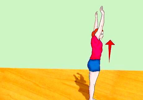 Stand up straight. Start with your feet together and your arms extended above your head. Stretch your body as far as you can with your shoulders right next to your ears. Tighten your abdominal muscles and stand on the balls of your feet. Inhale before you jump. Look straight ahead and choose a spot to focus on.