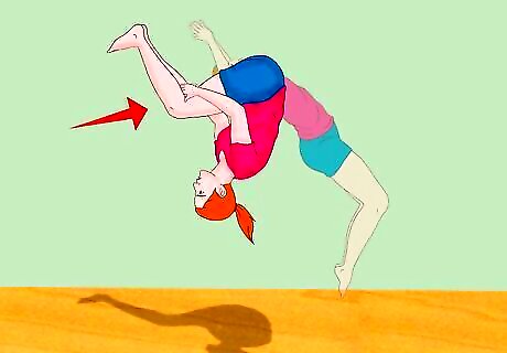 Have a strong rebound. Your round off rebound sets you up for your back tuck. If you have a weak rebound, you will not have a smooth transition between the two movements. Jump as high as you can when you land your round off. Imagine that you are trying to touch the ceiling. If you are having problems transitioning, practice landing your round off with your hands up in the air. Focus on keeping your back straight and landing with your knees bent. Before your rebound is finished, your body should be completely straight.