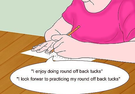 Use positive self-talk. Many people have a fear of going backwards. While you may actually be physically prepared and have the skills needed to perform a round off back tuck, you may be held back by your mental state. Positive affirmations can help you get over this fear. Write down statements such as "I enjoy doing round off back tucks" or "I look forward to practicing my round off back tuck." Take your affirmations with you to practice or say them out loud before, during, and after practice.