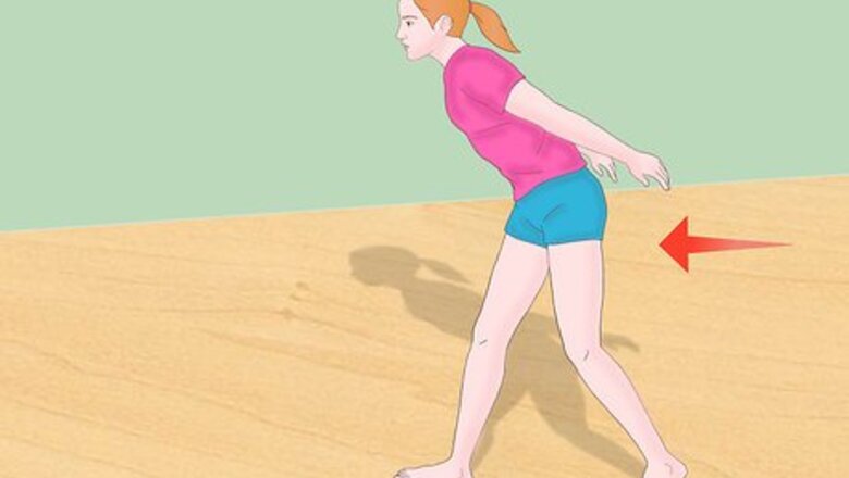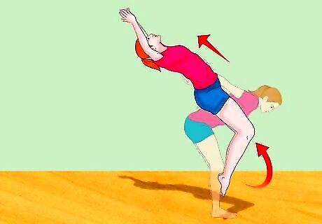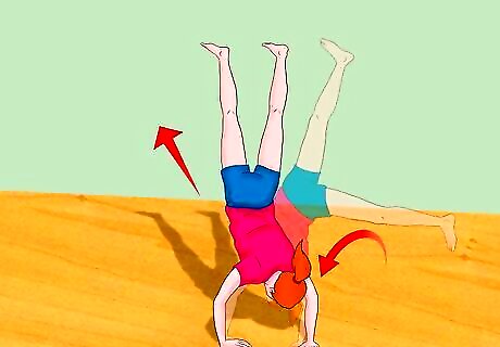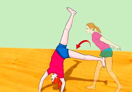 Plant your hands. Make a wide step with your left leg, reach your arms forward, and plant your left hand (your fingers should be pointing to the left) at a 90 degree angle in the direction that your round off is going. Plant your right hand right after you plant your left hand. The fingers of your right hand should be pointing back towards your body. Swing up your right leg as you plant your left hand and extend your knees and ankles. Your right leg should stay in line with your trunk. Keep your stomach tight as you make this movement. Your arms and legs should be fully extended.