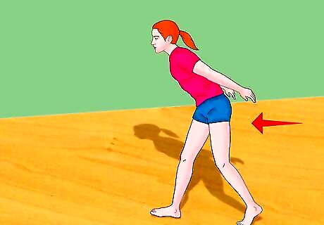 Bring your arms down. Swing your arms down to prepare for your jump. If you are a beginner, you will probably be more comfortable swinging your arms behind your back. However, for the best back tuck, stop your swing when your arms become horizontal. Bend your knees to a 45 degree angle as you swing your arms down. If you are beginner, bend your knees to a 90 degree angle as you swing your arms. Keep your upper body straight as you swing. You will want to lean forward, but do your best to stay upright.