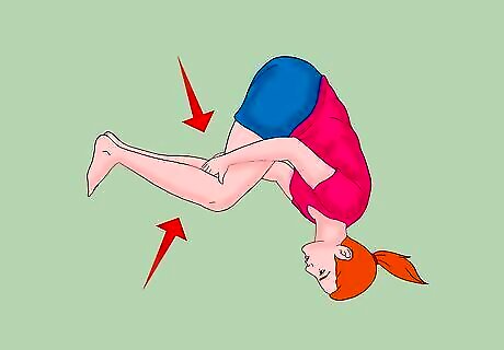Tuck your legs. Once you have reached the highest point and fully extended your body, tuck your legs and grab your shins. Bring your legs to your chest. Do not try to reach down and grab your legs. Stop looking at your focus point once you are in the tuck position. Round your back as you bring your knees and hands together. Keep your abdominal muscles tight during the tuck. Having good form during your tuck will help you rotate your body.