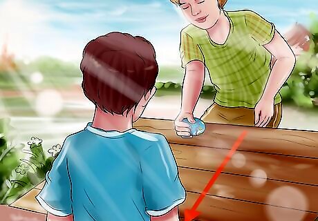 Consider color coding the eggs for children of different ages. If children with a wide range of ages or abilities will be hunting for Easter eggs, it might be more fun for everyone if different children search for different eggs. For instance, you could tell the older children that they should only look for the hard-to-find red eggs, while the purple eggs are left in easier places for the younger kids to find. If there are many children visiting, you could even write the name of each child on one or more eggs and instruct the children only to find eggs with their own name written on it. To avoid arguments, make sure each child has an equal amount of eggs, and that you know where every egg is hidden so you can help out. If a relatively older child gets upset that they aren't allowed to pick up certain eggs, encourage him or her to help out a younger kid by pointing to the easy to find eggs.