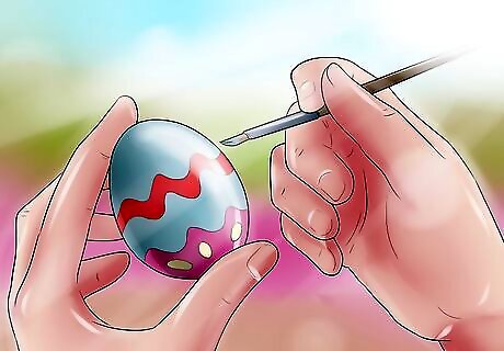 Have the kids decorate the Easter eggs. There are plenty of safe, easy ways to decorate eggs. Hard boil the eggs in advance, then have the children use crayons, food coloring and sponges, or paint to decorate the eggs. Children might want to keep their eggs once they've decorated them, so you might want to hide a separate group of decorated eggs for the egg hunt.