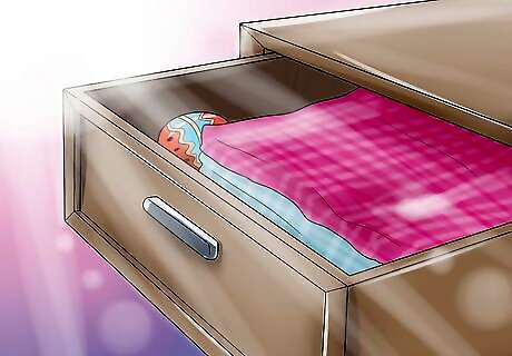 Hide the eggs in more difficult places for children aged six and up. Many children six and older enjoy looking for eggs in harder to find places, such as underneath or inside objects. The enthusiasm, height, and egg-finding abilities of children this age can vary widely, so hide some of these eggs in easier places than others. Place eggs on cupboard shelves or in drawers. You may hide them more behind a book or underneath a magazine for children on the older side of this range. Hide eggs in piles of other objects. Children this age will probably be more enthusiastic about looking through a pile of stuffed animals or in a basket of mail. Hide the eggs inside other objects. Hide an egg in a kitchen pot, pillowcase, or an upside down bowl.