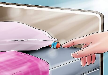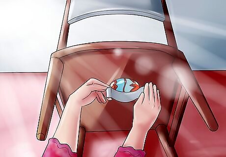 Hide the eggs in difficult locations for older children or an extra challenge. Even if you don't have any older children joining in the egg hunt, some of the younger kids might get enthusiastic and want to search for some difficult treasure. Remember that many adults enjoy helping the children find eggs, and coming up with clever locations might entertain them as well. Tape eggs to the underside of chairs and tables. This one goes from difficult to easy if the children are short enough to see them! Unplug a lamp, then unscrew the light bulb and rest an egg on top of the socket, hidden by the lampshade. You can use a similar trick with wide candlesticks. Use a toothbrush holder as an eggcup, hiding the egg behind brightly colored toothbrushes.