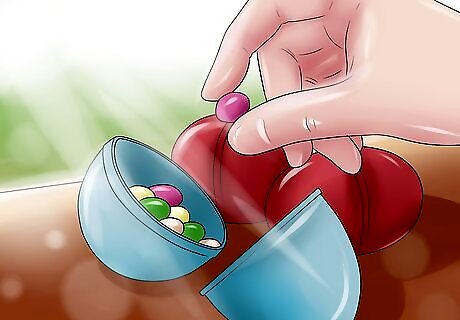Purchase treats if using plastic eggs. Plastic Easter eggs can be filled with goodies such as chocolate, candy, jelly beans, fruit, money, toys, or other small prizes that children will enjoy. Some families and groups choose to hide empty eggs, then distribute treats equally among the children after the hunt is over. Ask the parents of visiting children whether there are any treats you should avoid. Some children are allergic to nuts, and toddlers may not be able to eat chocolate or hard candies.