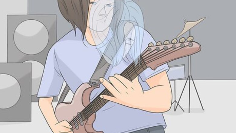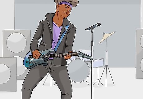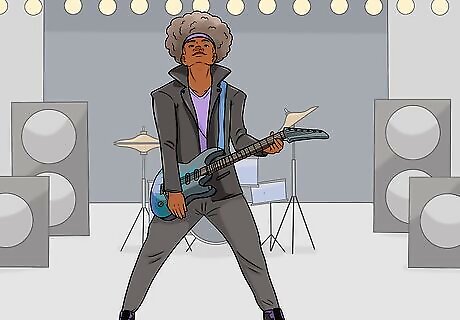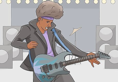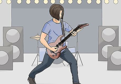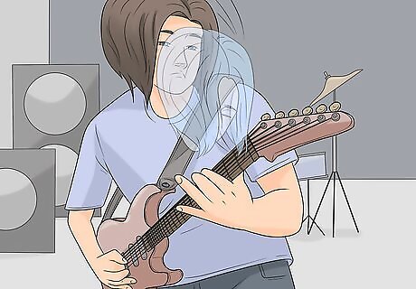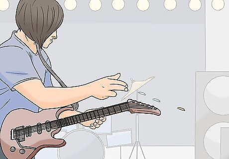 Exaggerate your movements so people in the back can see you. When you're performing in front of a live audience, particularly a large one, you have to make your movements large. That way, even the people in the far back can see them, and they will look intentional instead of accidental. For instance, if you're strumming extra hard, move your hand farther up and down than you normally would.