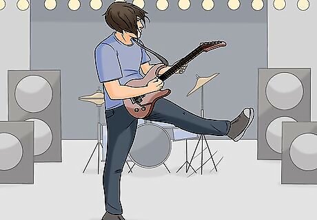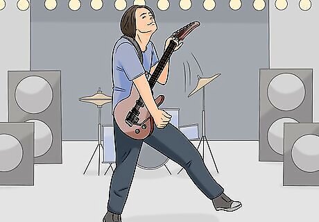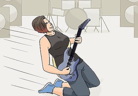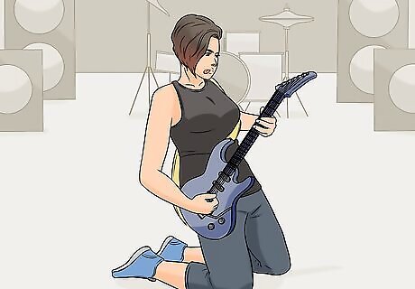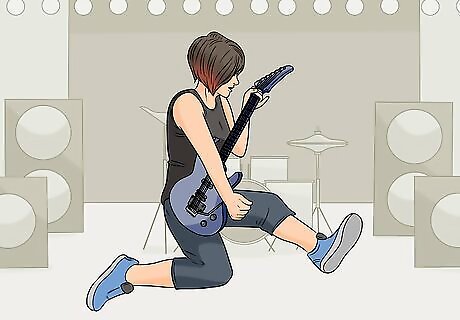 Take yourself down to your knees to show how awesome your solo is. As you're playing an amazing solo, slowly lower yourself to your knees. Finish playing the solo on the ground, then jump back to your feet! If you want to go all-in, you can even end up laying down on the floor, like Angus Young from AC/DC.