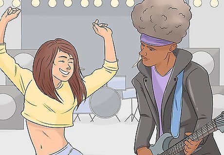 Bounce your head and move your body to the music. You don't need to be jumping around every few minutes to show you're into the music. You can simply do small movements like bouncing your head to the beat. Nod it up and down in time to the music, making sure that you do it hard enough to be noticeable. Similarly, make sure you're swinging your hips and moving your shoulders. You want to show the audience you're having a good time!