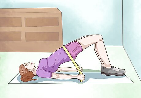 Use a resistance band in a traditional bridge position. Lay on the floor with your back against the ground and your knees bent. Wrap your resistance band over your hips. Stretch your arms out at your sides, pinning down the resistance band on either side. Lift your hips slowly, pushing against the resistance band. Keep your back straight as you lift your hips off the floor. Your knees should be in a 90 degree angle, and your shoulders will remain on the floor. Exercise bands can be found at a local sporting goods store, big box store, or even online.