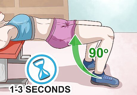 Hold the exercise once your legs make a 90 degree angle. For a successful hip thrust, your lower legs should be perpendicular to the ground with your knees creating a 90 degree angle with your upper legs. Once your body is parallel to the ground and your back is flat, hold the hip thrust for 1-3 seconds. Use your arms to hold onto the bench, stabilizing your movement. Tighten your glutes during the hold to get the most out of the exercise.