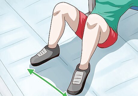 Place your feet flat on the ground shoulder-width apart. Set your feet on the ground so that they're directly under your knees when you lift your body up into the hip thrust. This means that while you're sitting down, your feet will be a little bit in front of your knees. Your heels shouldn't come off of the ground.