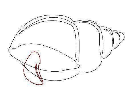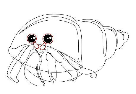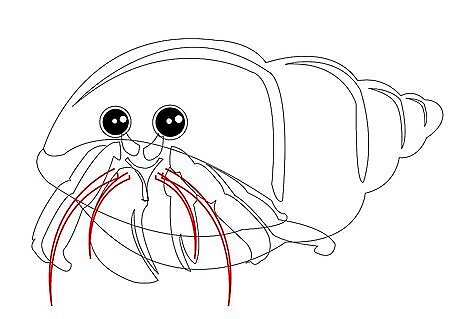 In the part of the shell that comes in a little draw two outward curving lines. Then on the bottom one draw a hermit crab leg. Repeat that and then draw the large pincher.