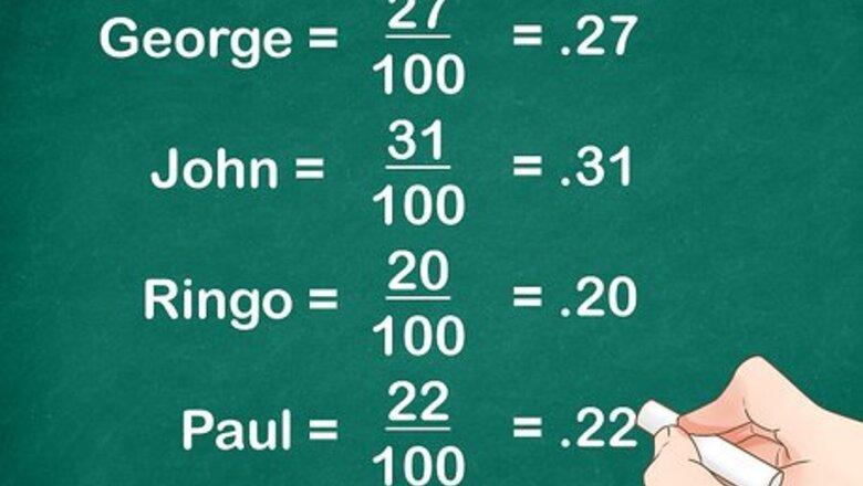 Calculate the ratio of each category. To find a ratio, place the number of responses a particular category received over the number of data points. Turn this into a percentage by dividing the numerator by the denominator. For example, you might have found the following data from your survey:Who is your favorite Beatle? George = 27 100 = .27 {\displaystyle {\text{George}}={\frac {27}{100}}=.27} {\text{George}}={\frac {27}{100}}=.27 John = 31 100 = .31 {\displaystyle {\text{John}}={\frac {31}{100}}=.31} {\text{John}}={\frac {31}{100}}=.31 Ringo = 20 100 = .20 {\displaystyle {\text{Ringo}}={\frac {20}{100}}=.20} {\text{Ringo}}={\frac {20}{100}}=.20 Paul = 22 100 = .22 {\displaystyle {\text{Paul}}={\frac {22}{100}}=.22} {\text{Paul}}={\frac {22}{100}}=.22