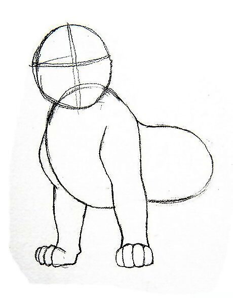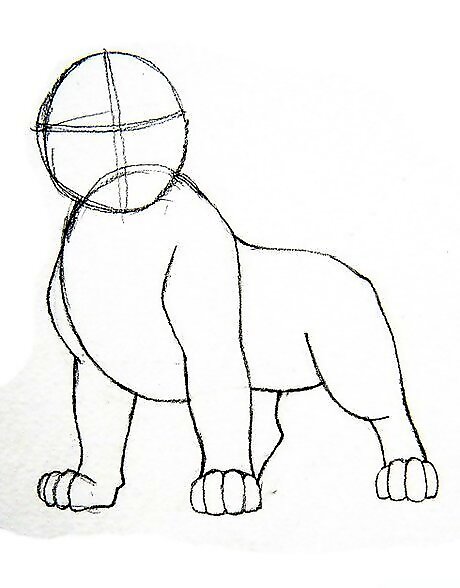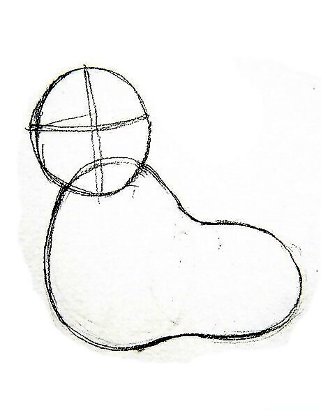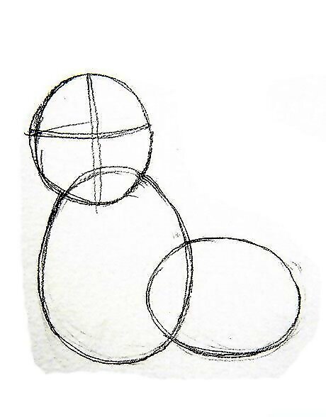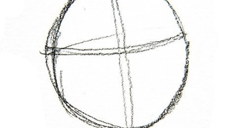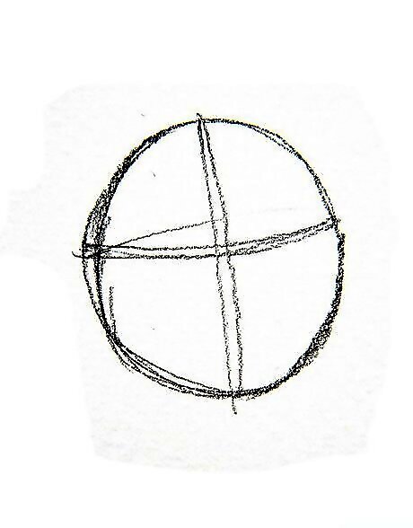 Start with a circle for the head and the line of action. Draw two guidelines (one vertical and one horizontal) to indicate his facial features.