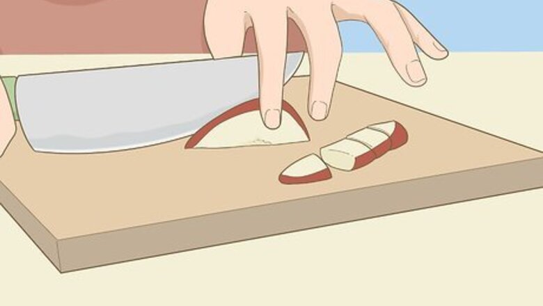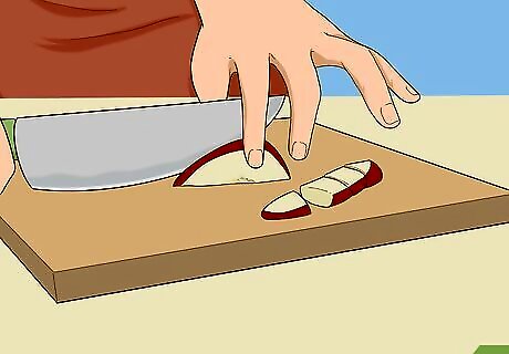 Core and dice the apple. The most straightforward way to eat an apple when you have braces is simply to cut it into small chunks. First, use an apple corer to remove the core and separate the apple into wedges. Then, cut the wedges into small chunks and enjoy. The smaller the chunks, the less likely you will be to damage your braces. Aim for pieces that measure one half inch or less in all directions. Choose apples that can stand straight up and don't slant to the side for an easier time coring. Place the apple on a cutting board for coring. A flat plate will work too, but don't choose an expensive plate. Apply slow but steady pressure to the corer with both hands until it passes all the way through the apple. You can chop up an apple without a corer by simply cutting it into quarters, slicing out the core with your knife, and continuing to chop the apple into smaller pieces. This will take a bit longer and you will need to be especially careful not to cut yourself.