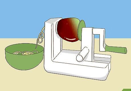 Create apple noodles. The spiralizer is another cool kitchen gadget that can help make apples more manageable for people with braces. Simply follow the instructions for inserting the apple into your spiralizer, turn the handle, and you will have thin strips of apple that look just like spaghetti. Eat your apple noodles with a fork or with your fingers.
