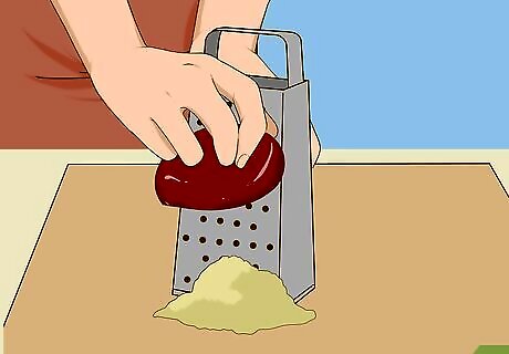 Grate the apple. If you want super small apple pieces, try shredding it with a grater. When you're finished, place your grated apple in a bowl and use a fork or spoon to eat it. If your grater stands up on its own, place one hand on top of the grater to keep it steady, and use the other hand to guide the apple over the blades. If your grater has a handle, hold it at an angle against the cutting board with the blades facing up and use your other hand to guide the apple back and forth over the blades. Once you get to the core, turn the apple around and continue grating the other sides. Be careful not to get your fingers too close to grater. You might not be able to grate the entire apple. Make sure you do this over a cutting board or a large plate. It is likely to make a bit of a mess.