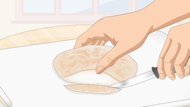 Cut your pita bread and pop it open to create a pocket. To make a quick pita pocket, set it on a cutting board and slice off the top 1–2 inches (2.5–5.1 cm) at a slight angle. Gently open it up and slide the extra piece inside to give the pita a little extra stability. Choose a tasty white pita bread for the richest flavor, or go for a whole wheat version if you want a healthier option. A pita pocket sandwich is a great option for a quick lunch or dinner, and can even be eaten for breakfast.