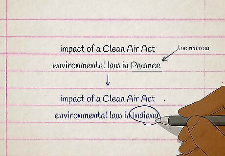 Broaden your scope if you're not getting enough results from your keywords. Sometimes, you'll type in your keywords and only get a handful of results—or worse, nothing at all! If you were doing an original study, this would be great. But you can't write a research paper without sources, so if you're not getting a lot of hits, you'll have to cast a broader net. For example, suppose you wanted to research the impact of a particular environmental law on your hometown, but when you did a search, you didn't get any quality results. You might expand your search to encompass the entire state or region, rather than just your hometown.