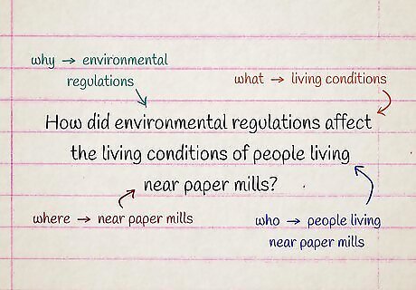 Use the 5 W's (who, what, when, where, and why) to write your question. You don't have to answer all of these questions, but they can help you narrow your focus. Ultimately, this research question will be the driving force behind your research and your entire paper. For example, your research question might be something like "How did environmental regulations affect the living conditions of people living near paper mills?" This question covers "who" (people living near paper mills), "what" (living conditions), "where" (near paper mills), and "why" (environmental regulations).