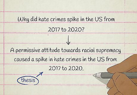 Your thesis is the answer to your research question. Once you've got a little bit of research under your belt, you should be able to decide how you want to answer your research question. Then, you'll do additional research to prove or disprove your thesis. For example, suppose your research question is "How did environmental regulations affect the living conditions of people living near paper mills?" Your thesis might be something like: "Environmental regulations improved living conditions for people living around paper mills." As another example, suppose your research question is "Why did hate crimes spike in the US from 2017 to 2020?" Your thesis might be: "A permissive attitude towards racial supremacy caused a spike in hate crimes in the US from 2017 to 2020." Keep in mind, you don't have to prove that your thesis is correct. Proving that your thesis was wrong can make for an even more compelling research paper, especially if your thesis follows conventional wisdom.
