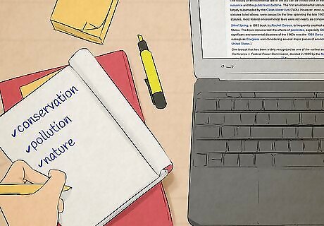 Jot down words related to your topic to search for sources. For some topics, you'll include proper nouns, such as the name of a specific person you're researching. If your topic is more conceptual, on the other hand, include synonyms as well as the specific terminology you plan to use in your paper. For example, if you've chosen environmental regulations as a topic, you might also include keywords such as "conservation," "pollution," and "nature."