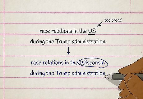 Narrow your topic to a specific time period, geographic area, or population. If you're getting hundreds of results on your topic, try another search with something more specific. You might need to narrow your topic in more than one way to find something narrow enough that you can do it justice in your research paper. For example, suppose you decided to look at race relations in the US during the Trump administration. If you got too many results, you might narrow your results to a single US city or state. Keep in mind how long your research paper will ultimately be. For example, if there's an entire book written on a topic you want to write a 20-page research paper on, it's probably too broad.