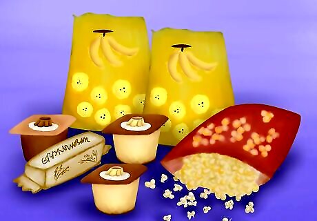 Prepare small bags of healthy snacks. Pass with the ideas of chocolate or marshmallow fluff sugared candy. Add a handful of store bought or homemade items into a zippered snack plastic bag. Granola, with nuts such as pecans Dried fruit, such as banana chips or cranberries Sugar/fat free pudding boxes Mini popcorn package; most "mini" bags typically are meant for a single person Crackers Non-candy that resembles bunnies or chicks