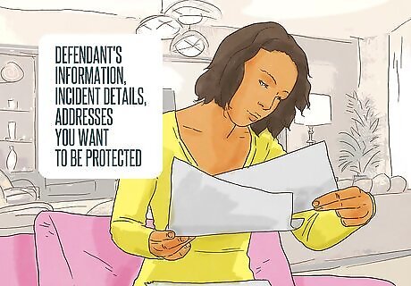 Gather helpful documents. If you qualify for an order of protection, you will need to obtain certain documents to take with you to the courthouse. The information you bring will help you fill out the court forms and answer questions. While each local courthouse may have different requirements, in general, you should have the following documents close and available: Your picture ID Addresses of places you would like protected (e.g., schools, homes, work) Personal information about the defendant Details about the incidents that led you to apply for an order of protection Information about minor children that are involved