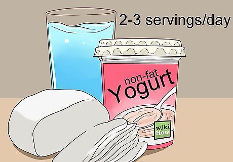 Include 2 to 3 servings of low fat or nonfat dairy products in your daily diet. On the DASH diet, you will be consuming only low fat or nonfat dairy products. These foods contain important dietary components including calcium and protein. A serving of dairy is 1 cup of milk, 1 cup of yogurt, or about 1.5 ounces of cheese. Good dairy choices include skim or 1% milk, nonfat yogurt, and part skim mozzarella cheese.