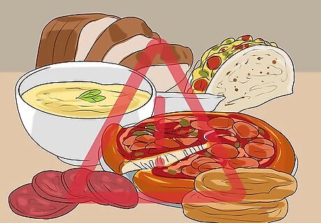 Watch out for the “salty 6.” There are 6 foods that are notorious for having high levels of sodium, and it is important to watch out for these foods when attempting to follow the DASH diet. These foods include: Cold cuts and cured meats. Deli meats and cured meats can be extremely high in sodium, with up to 1,050 mg of sodium per serving. Read the labels and look for low sodium options. Pizza. Pizza has a high sodium content due to the sauce, cheese, and even the dough. Some of the toppings can also add extra sodium, like pepperoni and olives. A slice may even have up to 760 mg of sodium. Try making your own pizza at home with a low-sodium sauce and by using fresh cut veggies as toppings. Soup. A can of soup can contain half of your daily sodium requirement! Read the labels on soup cans and look for low sodium options. You can also try making a low-sodium version of an old favorite at home, like split pea soup. Breads and rolls. Always check the packages of any bread you buy in the grocery store. They can contain up to 230 milligrams of sodium per slice! Chicken. Processed chicken like chicken patties, chicken nuggets, and other fast food chicken concoctions can contain a large amount of sodium. Try to stick with fresh chicken breast and avoid eating chicken that has been breaded or marinated in a salty sauce. Burritos and tacos. The seasoning often used for preparing burrito and taco meat fillings is loaded with sodium. Avoid using these seasoning blends or opt for a reduced-sodium version.