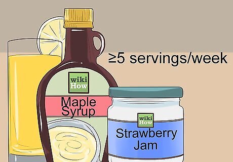 Consume 5 or fewer servings of sweets each week. On the DASH diet, you will need to keep your consumption of sugar and sweets in check. This means consuming 5, but preferably fewer, sweets per week that are low in fat. Examples include 1 tablespoon of maple syrup, 1 tablespoon of jelly or jam, or 1 cup of lemonade. Opt for low-fat sweets when you do indulge, such as jelly beans and low-fat frozen yogurt. Watch out for added sugar in everything from dry cereal to condiments. Always check the label to find out what the sugar content is before you decide to eat something. Try replacing sugar with artificial sweeteners. For example, if you usually take sugar in your coffee or tea, replace it with stevia or Splenda. You can also opt for sugar-free versions of things like diet soda. Make sure that you check the sodium levels of any sweets that you eat as well. Add these amounts to your daily sodium intake tally.