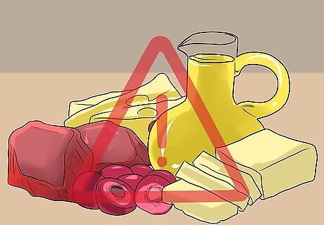 Limit foods high in saturated fats. The DASH diet requires you to limit foods that contain high amounts of saturated fats, such as fatty meats and full-fat dairy products. You should also avoid tropical oils like palm oil, coconut oil, and palm kernel oils, which are all high in saturated fats. Cut back on your intake of meat, cheese, butter, and other fatty animal products. Try substituting for healthier options wherever you can. For example, you can opt for lean meats, low-fat cheeses, and even light butter. Be sure to check the sodium content of all of these foods as well. These amounts must be included in your daily sodium tally.